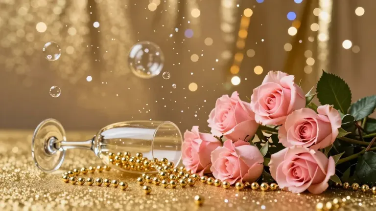 A bouquet of soft, velvety pink roses and elegant champagne flutes are arranged on a shimmering golden surface, with smooth, reflective golden beads adding a luxurious touch. The diffused, warm light highlights the roses and beads, creating a festive and luxurious backdrop with a shallow depth of field.