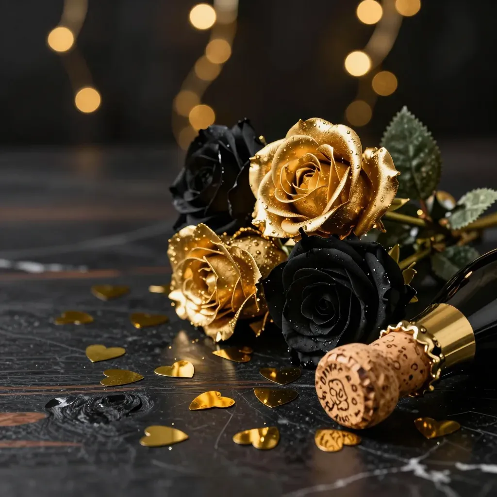 A luxurious arrangement of golden and black roses with champagne cork and heart confetti, illuminated by warm ambient light that highlights the glossy petals and smooth textures, creating a festive and elegant ambiance with a shallow depth of field that draws focus to the roses.
