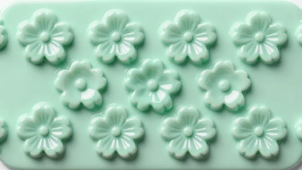 A close-up of glossy, mint green flower-shaped rosettes in a silicone mold, softly lit to highlight their texture and depth, with a blurred background emphasizing the rosettes.