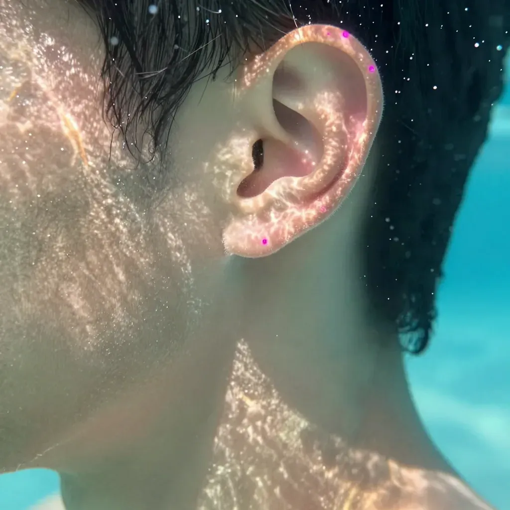 A close-up of a person's ear and jaw with a rough skin texture and glossy sheen, illuminated by diffused, soft lighting that creates a shimmering effect. The deep blue background, resembling water, adds a serene and ethereal quality to the image.