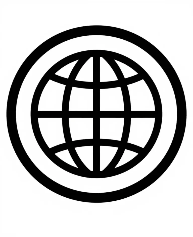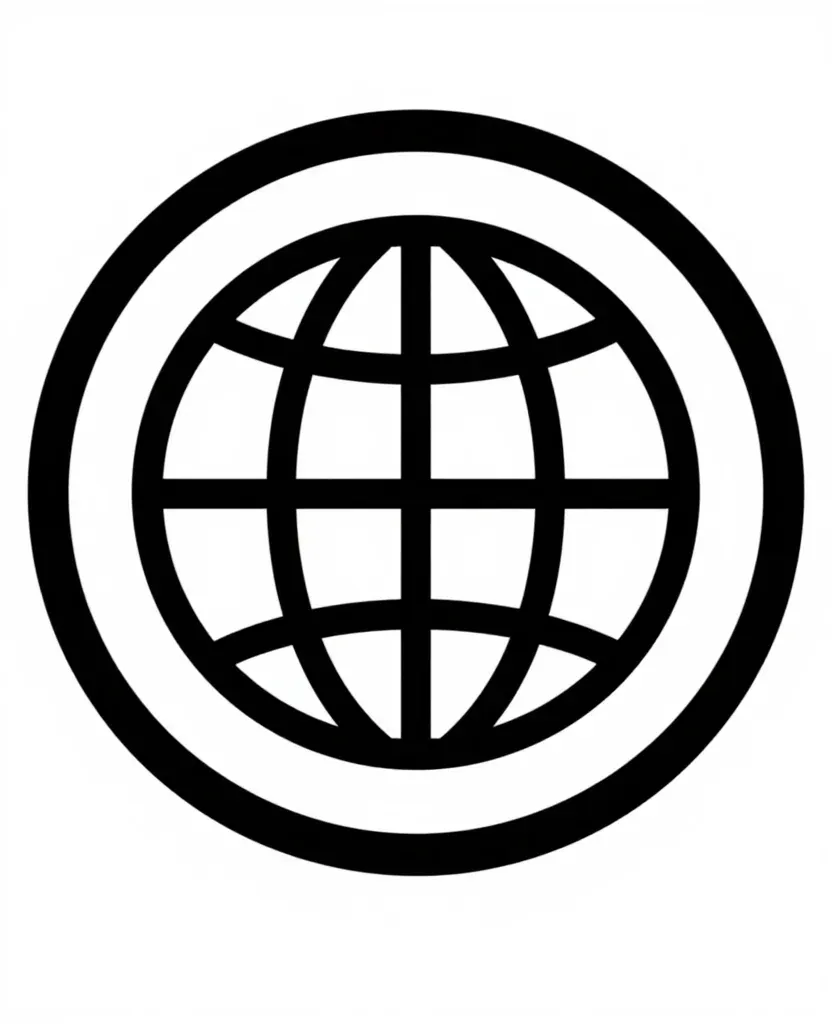 A bold black globe grid symbol with uniform, flat lighting and a clean white background, emphasizing simplicity and clarity. The symmetrical composition and uncluttered backdrop make it ideal for global or international themes.
