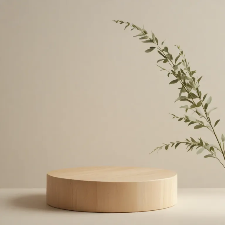 A smooth, glossy wooden pedestal with delicate green leaves softly illuminated by diffused light, creating a serene and minimalist composition. The neutral beige background enhances the natural tones and textures of the subject, providing ample copy space for design elements.