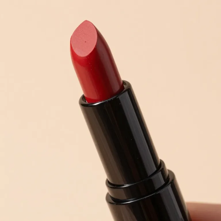 A close-up of a deep red lipstick smear on a glossy stick, highlighting its smooth texture and vibrant color under soft, diffused lighting. The neutral beige background provides a clean contrast, emphasizing the product's details and making it ideal for advertising or product catalogs.