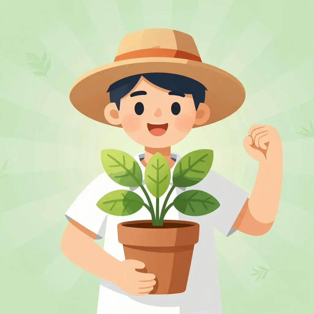 A botanist in a straw hat holds a glossy, broad-leaved plant, illuminated by soft, natural sunlight. The image has a shallow depth of field, focusing on the subject against a light green background with subtle leaf patterns.