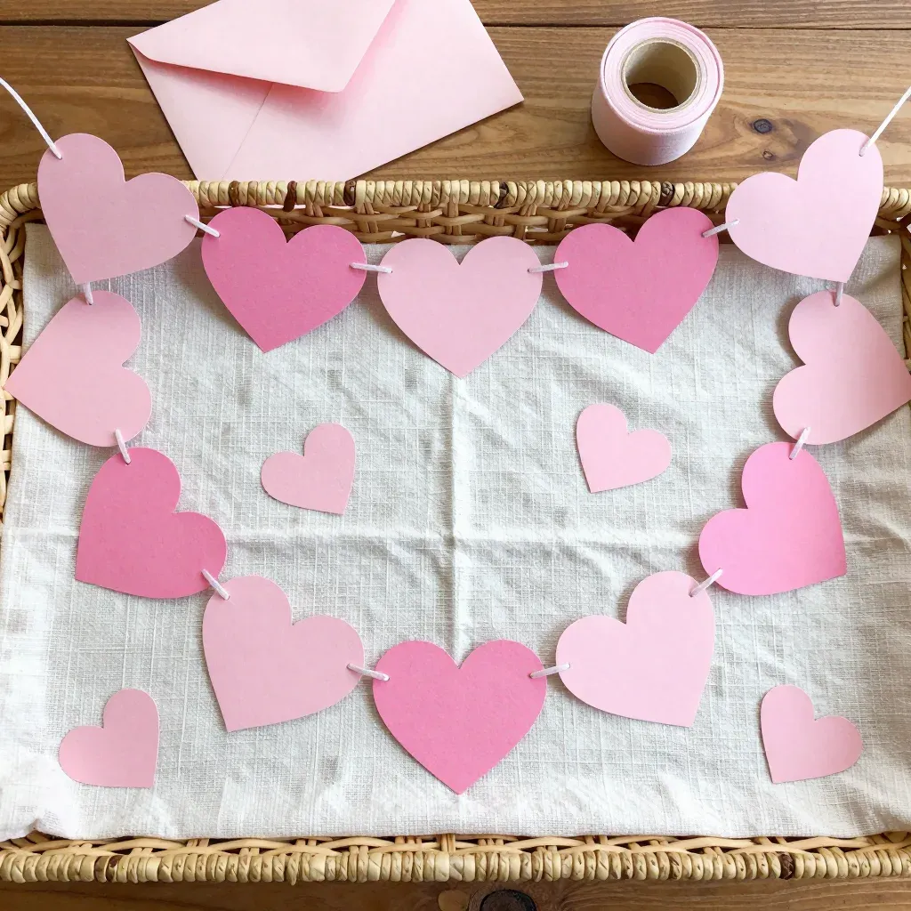 A soft pink paper heart garland hangs on a woven basket, illuminated by natural, diffused light that highlights the texture of the paper. The composition is clean, with a neutral background that complements the pink hearts, creating a serene and romantic atmosphere.
