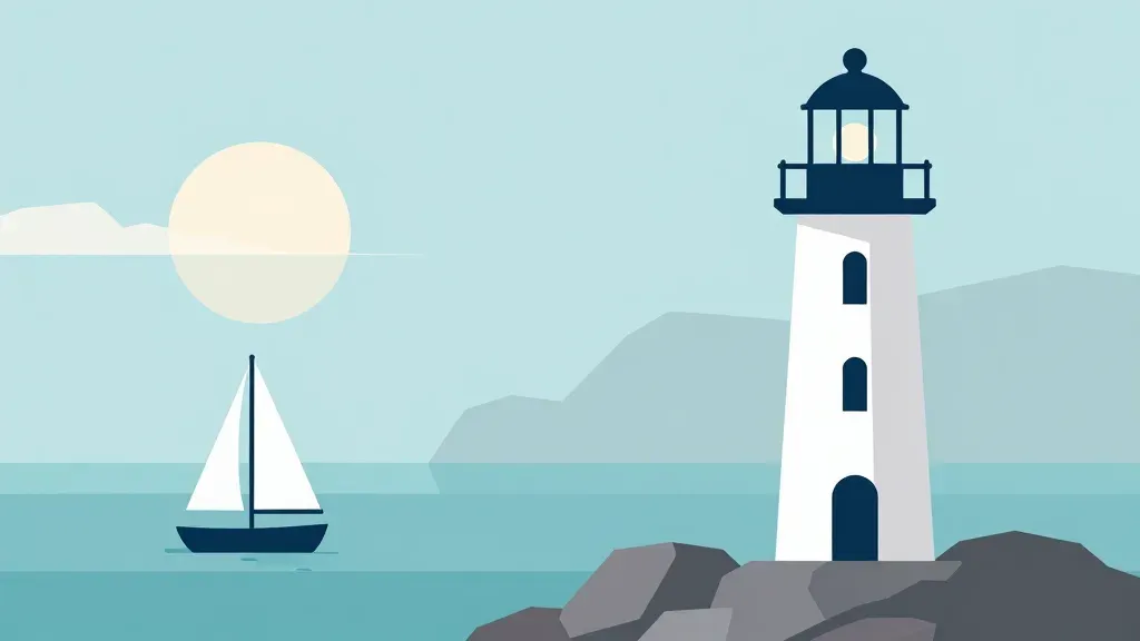 A serene lighthouse and sailboat are silhouetted against a soft, diffused sunlight, casting long shadows and creating a tranquil coastal scene. The composition emphasizes the lighthouse as the focal point, with the sailboat in the background, adding depth and scale to the image.