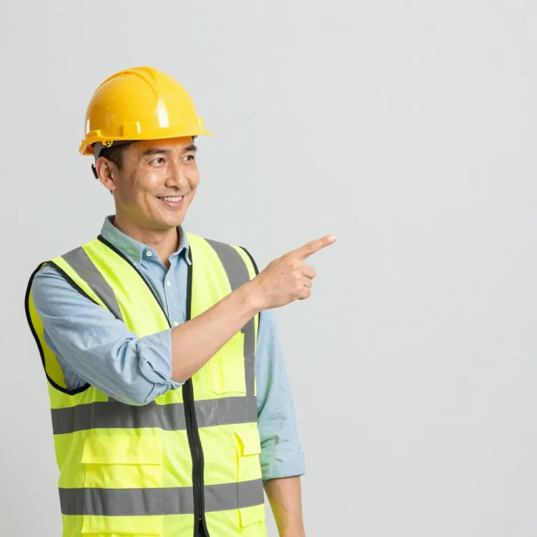 A construction worker in a yellow hardhat and high-visibility vest points to the right, with a soft, even light highlighting his reflective vest and shirt. The plain, light gray background ensures the focus remains on the subject and his gesture.