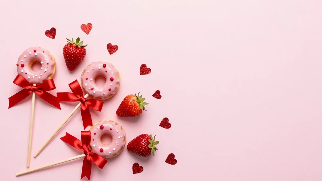 A flatlay arrangement of donuts, strawberries, hearts, and ribbons with glossy icing and smooth textures, softly lit from above to create gentle highlights and shadows. The shallow depth of field and soft pink background emphasize the treats, offering ample copy space.