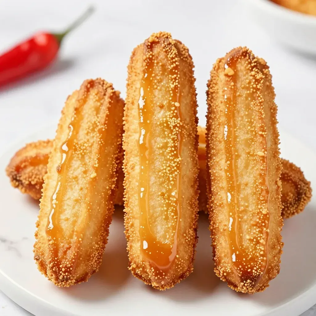Three golden-brown, sesame-coated fried sticks stand upright in a triangular formation, glistening with a viscous honey glaze that drips down their sides, revealing a crispy exterior and implied soft interior. Soft diffused lighting highlights the granular texture and warm tones, while a shallow depth of field isolates the subject against a clean white background with a blurred red chili pepper for contrast.