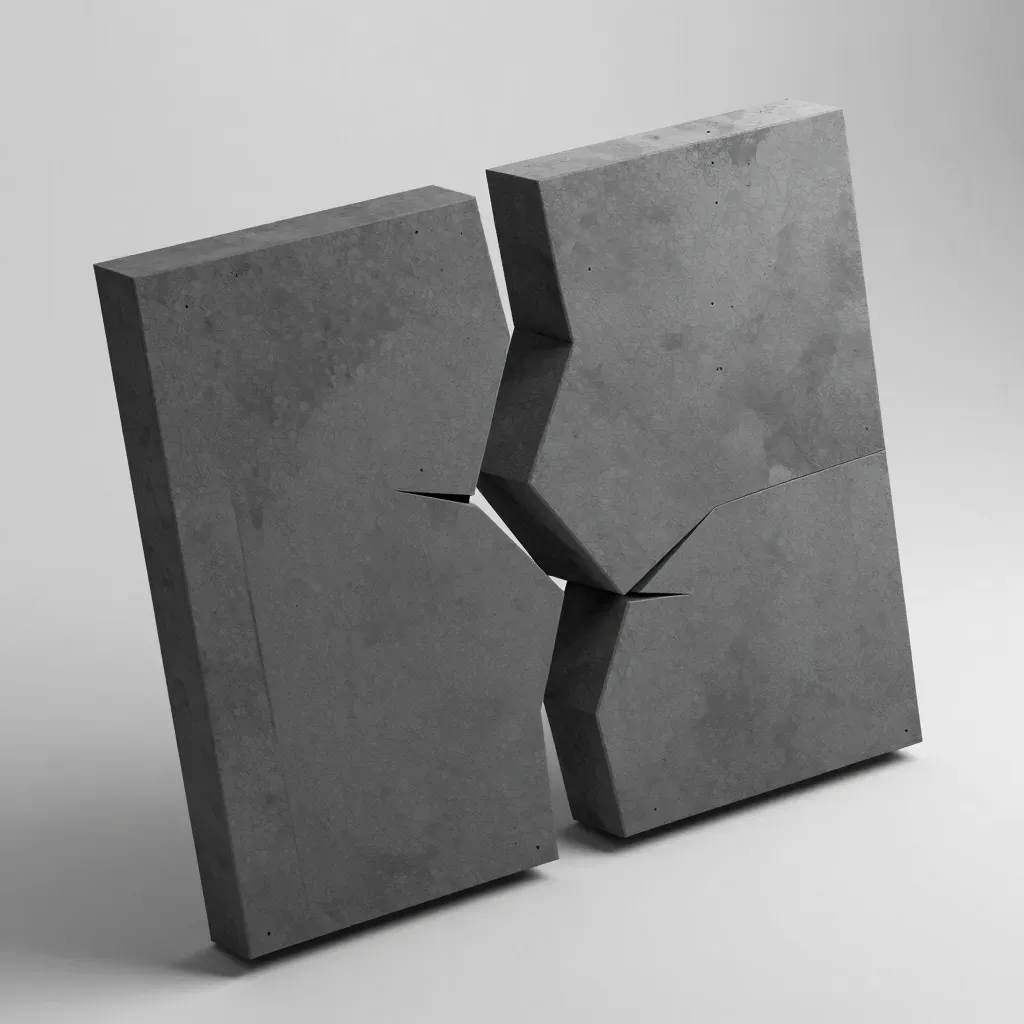 Two large concrete plates with visible cracks and speckles are balanced against each other, creating a sense of depth and tension. The soft, diffused lighting highlights the texture and form of the concrete, while the plain white background emphasizes the subject.