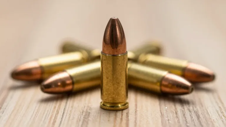 Five brass-cased ammunition rounds are arranged with one standing upright and four fanned horizontally, showcasing polished brass casings and copper-jacketed tips with slight wear and tarnish. Soft diffused lighting from the upper left creates gentle highlights and shallow depth of field isolates the central bullet against a blurred wooden background.