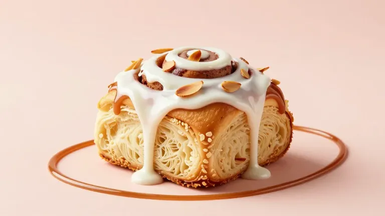 A golden-brown almond-icing twist bun, topped with glossy white icing and crunchy almond slivers, bathed in warm, soft light that highlights its textures and glossy surface. The light pink background ensures the focus remains on the delectable pastry, offering ample copy space for branding or text placement.