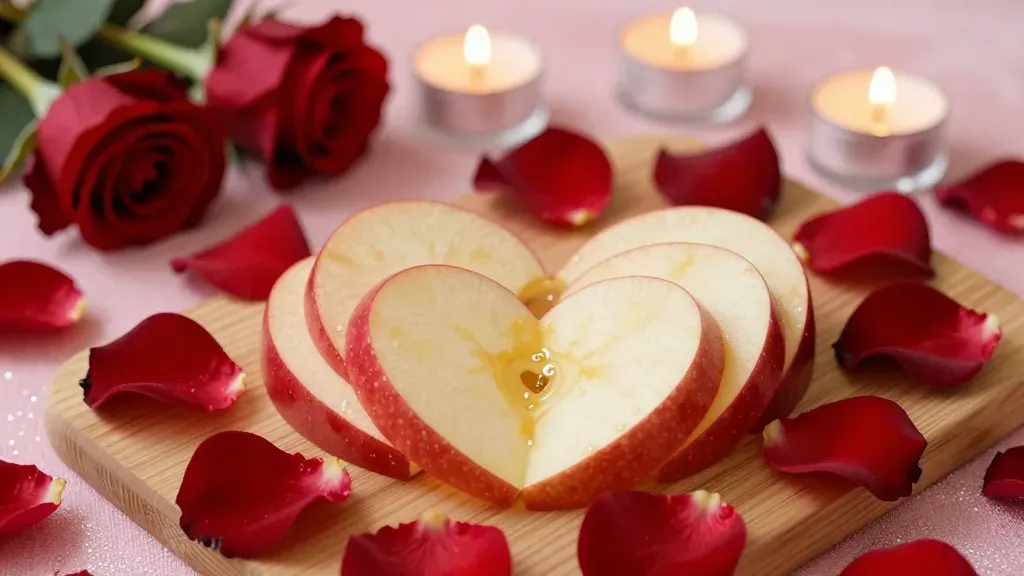 A heart-shaped apple carved into fanned slices, coated in glossy honey, rests on a wooden board surrounded by crimson rose petals and soft candlelight. The top-down, slightly angled perspective with shallow depth of field emphasizes the central subject while the warm, directional lighting enhances the romantic ambiance and highlights the moist texture of the apple flesh.
