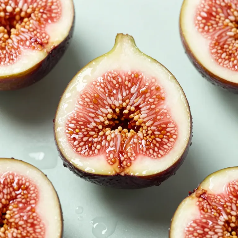 A close-up view of a cross-section of figs, showcasing their juicy, soft flesh and glossy seeds against a vibrant pink and white color palette. The soft, diffused lighting highlights the natural contours and textures, creating a visually appealing and detailed image.