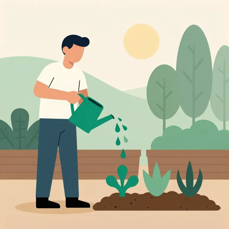 A man carefully waters young seedlings with a green watering can, set against a serene garden backdrop with soft, golden sunlight casting gentle shadows. The composition highlights the watering action with a shallow depth of field, focusing on the vibrant green seedlings and moist soil.