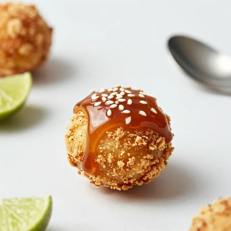 A golden-brown fried mochi ball coated in a crispy granular crust, drizzled with glossy amber caramel sauce and sprinkled with creamy white sesame seeds, accompanied by vibrant lime wedges. Soft directional lighting from the upper left enhances the textures and creates gentle shadows, while shallow depth of field isolates the subject on a clean off-white background with subtle bokeh.