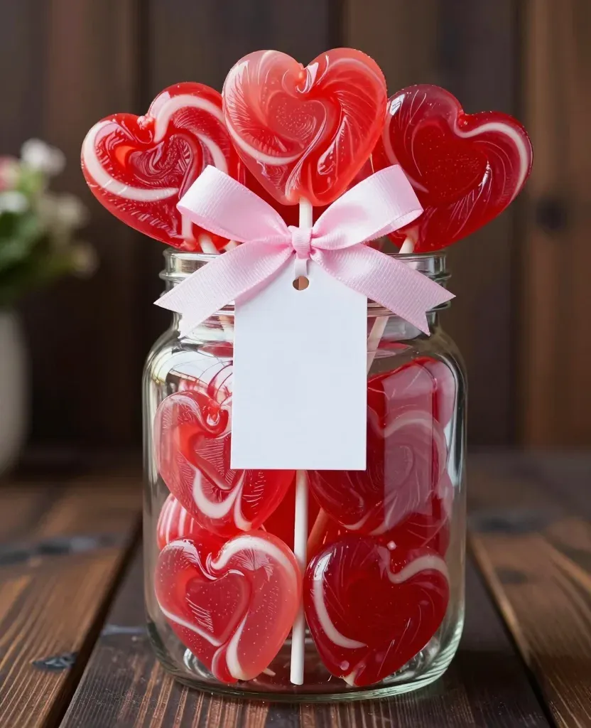 A collection of glossy, translucent red heart-shaped lollipops with white swirls, tied with a pink ribbon, displayed in a glass jar with soft natural light highlighting the glossy texture and reflections. The shallow depth of field blurs the wooden surface and floral arrangement in the background, creating a focused and elegant composition.