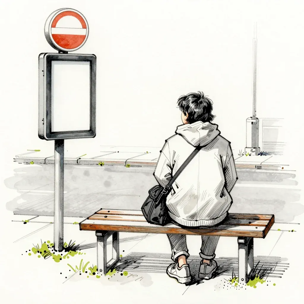 A person sits on a rough, weathered wooden bench at a bus stop, with soft, diffused light casting gentle shadows. The muted tones and splashes of green paint add a touch of urban grit and artistic flair to the scene.