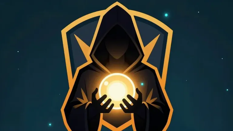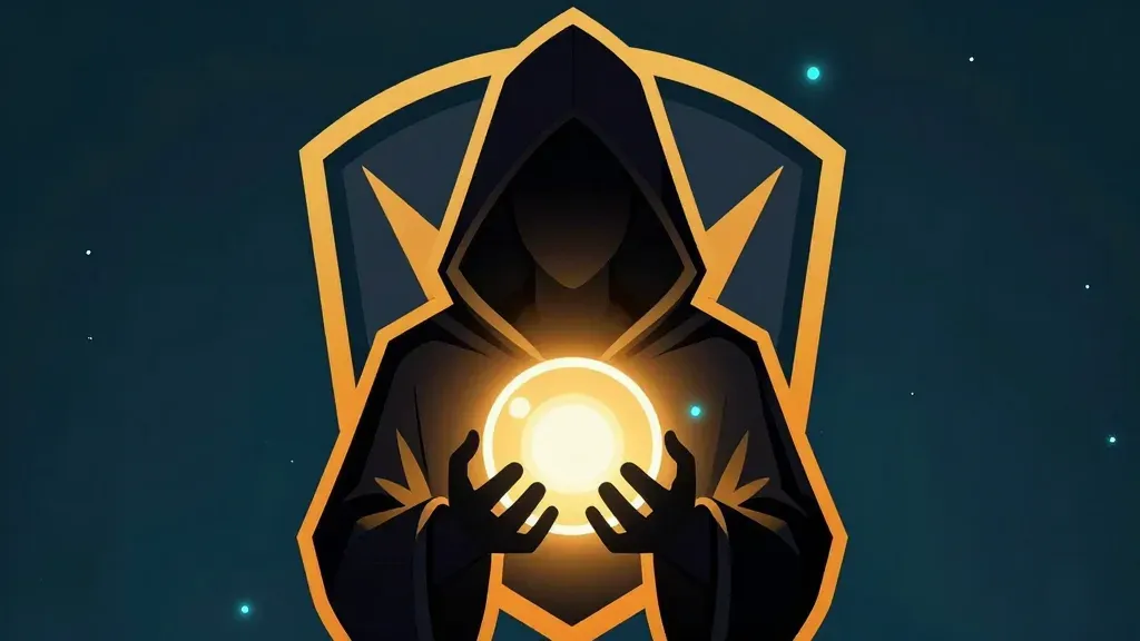 A hooded mage figure cradles a luminous orb within a sharp-edged, embossed gold crest, the orb casting a warm radiance that contrasts with the matte, velvety cloak. The symmetrical composition and shallow depth of field focus attention on the central subject against a star-speckled cosmic void.