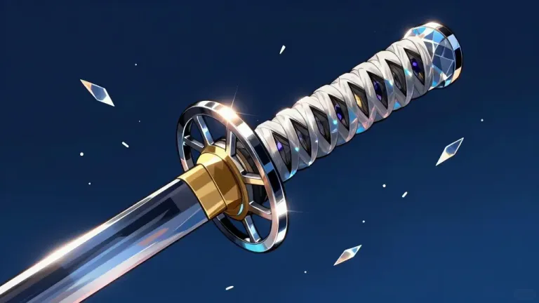A close-up of a crystal katana hilt, its glossy, metallic surface reflecting starlight, creating a high-contrast, ethereal glow. The dark, starry sky background enhances the hilt's intricate spiral design and reflective properties, providing a sense of depth and focus.