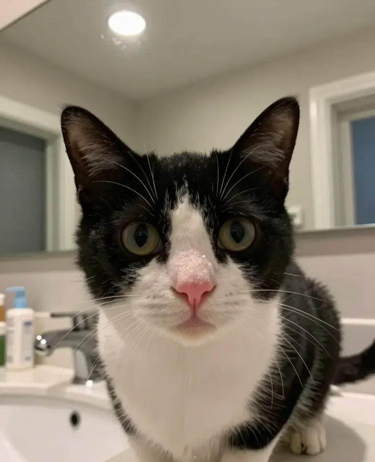 A close-up of a black and white tuxedo cat with a glossy coat and soft pink nose, sitting on a bathroom counter, directly engaging with the camera. The warm, diffused lighting highlights the cat's features and fur texture, creating a shallow depth of field that blurs the background, emphasizing the subject.