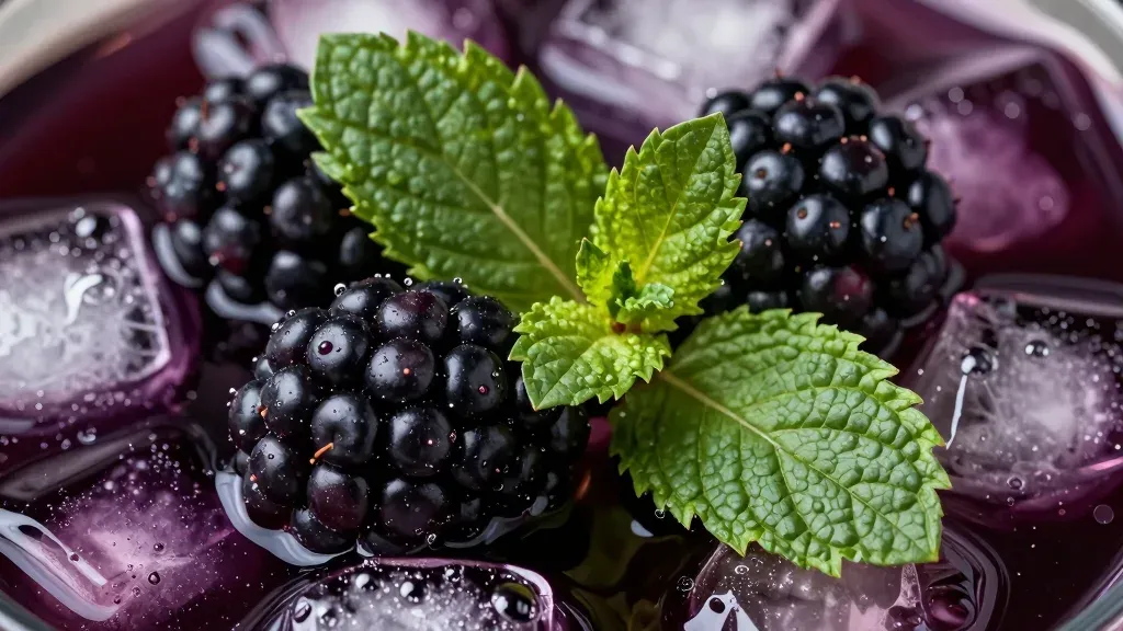 Glossy blackberries and a crisp mint sprig float in a viscous purple liquid surrounded by faceted ice cubes, with soft highlights reflecting off the berries and ice. The shallow depth of field isolates the central elements against a blurred glass rim and bokeh background, emphasizing the textures and colors of the drink.