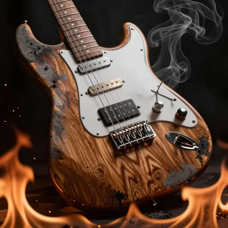 A vintage electric guitar with charred and blackened areas, set against a smoky, dark background with hints of fire, creating a dramatic and intense visual. The close-up, shallow depth of field emphasizes the guitar's glossy wood grain and metallic hardware, with high contrast lighting that highlights the textures and details.