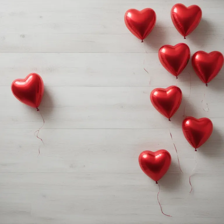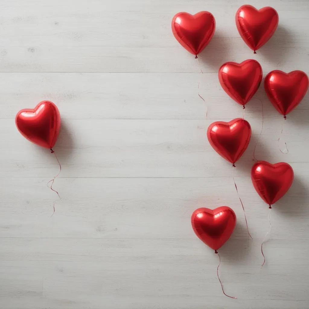 Glossy red heart-shaped balloons float against a rustic white wooden backdrop, illuminated by soft, diffused light that highlights their reflective surfaces and casts gentle shadows, creating a sense of movement and spontaneity in a clean, natural setting.