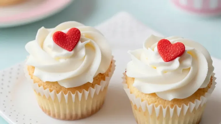 Close-up of vanilla cupcakes topped with smooth, creamy white frosting and glossy red heart decorations, illuminated by soft overhead lighting that highlights the texture and vibrant colors. The clean, light blue and white background ensures the cupcakes stand out, making this image ideal for culinary or celebratory themes.