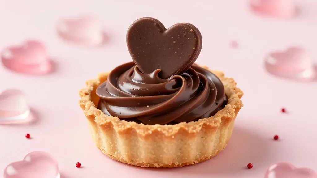 A chocolate tart with smooth ganache and a heart-shaped chocolate topper sits centered, showcasing a crisp pastry shell and glossy chocolate surface. Soft diffused lighting creates gentle highlights and shallow depth of field emphasizes the tart against a blurred pink background with scattered heart confetti.