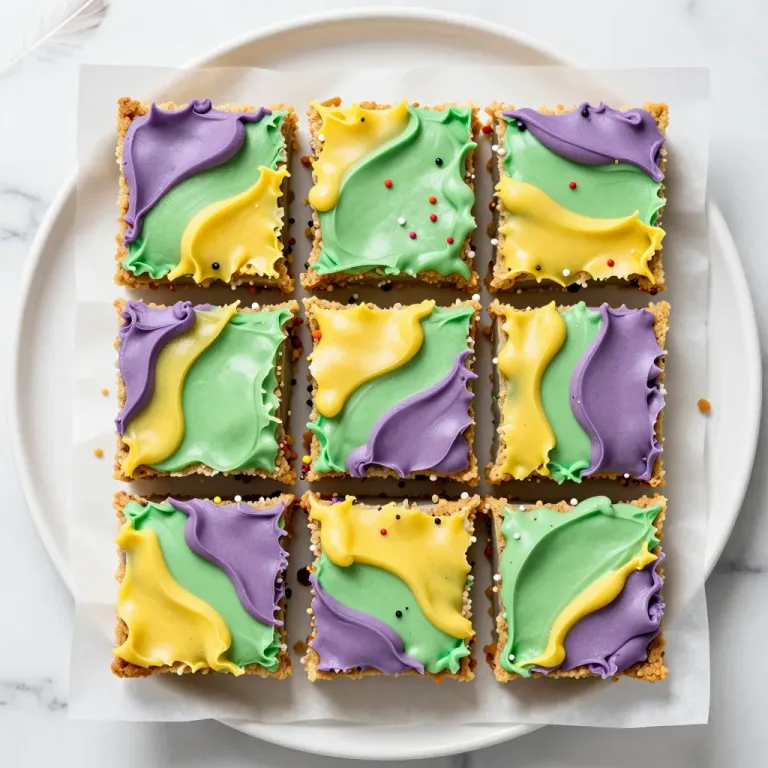 A vibrant arrangement of confetti cookie bars with glossy purple, green, and yellow icing, sprinkled with confetti, set against a soft, diffused light that highlights the golden cookie base and glossy icing. The clean white marble countertop background ensures the focus remains on the colorful, textured dessert bars.