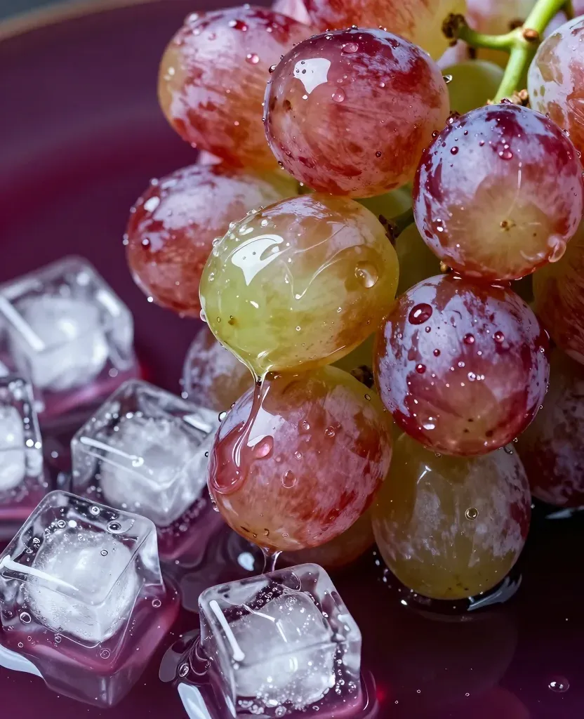 Juicy grapes glisten with jelly and ice, highlighting their texture and freshness under soft, diffused light. The dark, blurred background emphasizes the subject, creating a shallow depth of field.