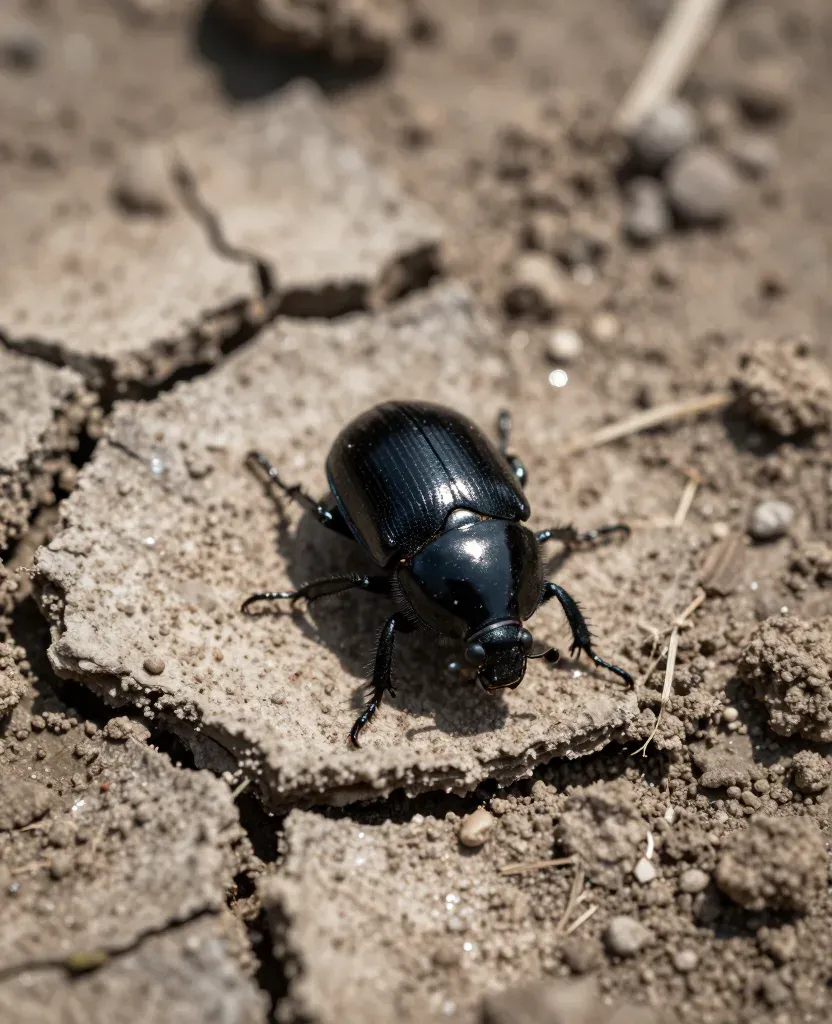 A glossy black beetle clings to dry, cracked soil under direct sunlight, creating strong highlights and deep shadows. The shallow depth of field blurs the background, focusing attention on the beetle's intricate details and the texture of the soil.