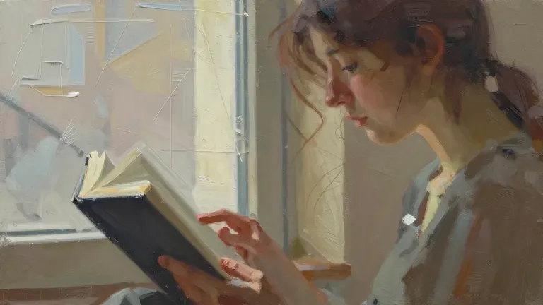 A young woman is engrossed in reading a book by a window, with soft, diffused light highlighting her face and the book. The textured brushstrokes and warm color palette create a serene, intimate atmosphere, ideal for a quiet reading nook or study setting.