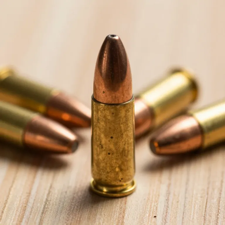 A centered brass-cased bullet with a copper-jacketed tip stands sharply in focus, while three additional rounds lie blurred in the background on a light wooden surface. Soft directional lighting from the upper left creates gentle highlights and a shallow depth of field emphasizes the central subject against a clean, out-of-focus backdrop.