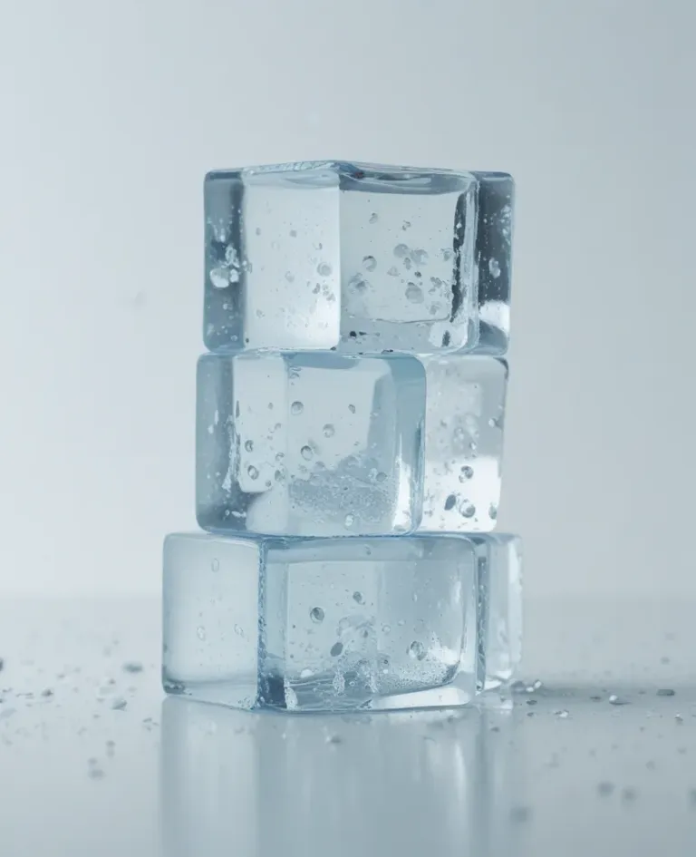 A pyramid of ice cubes with a soft, diffused light highlighting their texture and creating a gentle glow. The blurred, white background emphasizes the ice cubes as the focal point, offering ample copy space for design integration.