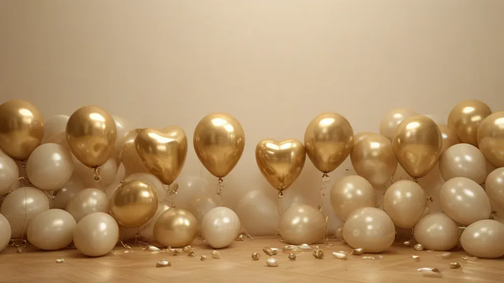Glossy golden balloons and delicate confetti create a festive atmosphere on a warm, ambient-lit wooden floor. The neutral beige wall in the background enhances the focus on the vibrant foreground elements, offering ample copy space for design integration.