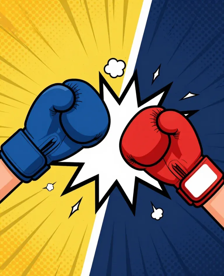 Two glossy boxing gloves, one royal blue and one crimson red, clash mid-air with a sharp white explosion effect, their smooth leather surfaces reflecting stylized light. The symmetrical diagonal composition with radiating sunburst and halftone patterns creates a dynamic, comic-book style background with ample negative space for text or branding.