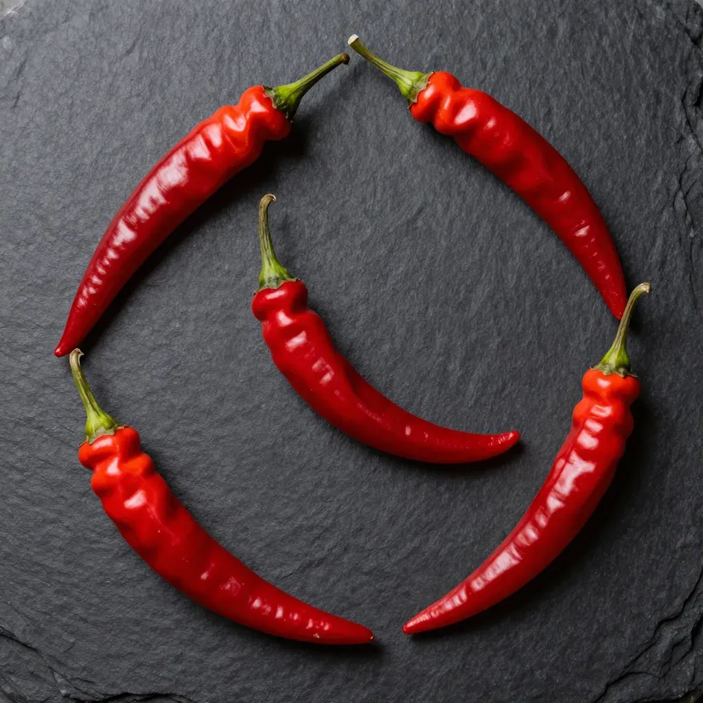 Smooth, glossy red chili peppers arranged in a loose spiral on a dark, textured surface, softly lit to highlight their vibrant color and subtle ridges. The shallow depth of field draws attention to the peppers, creating a visually striking composition.