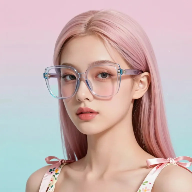 A model with long, glossy pink hair and translucent glasses with a gradient from clear to light blue, set against a soft, diffused gradient background transitioning from light pink to soft teal. The shallow depth of field highlights the texture of the hair and glasses, creating a clean and focused composition.