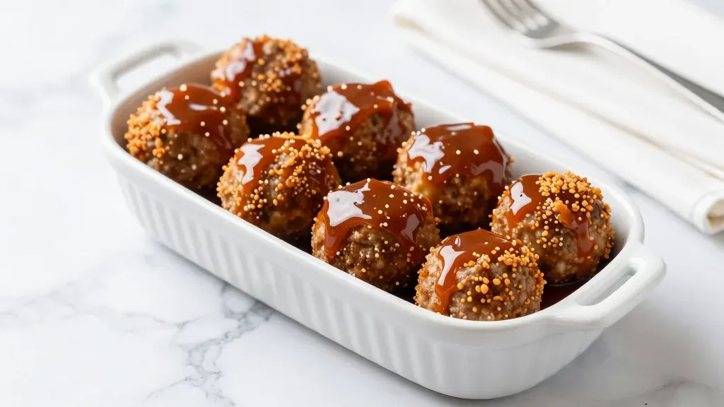 Eight meatballs coated in a glossy amber glaze and toasted breadcrumbs are arranged diagonally in a white ceramic dish, showcasing a rough granular texture and viscous sauce pooling at the base. Soft diffused lighting from the upper left creates gentle highlights and subtle shadows, with a shallow depth of field emphasizing the center meatballs against a clean marble background.