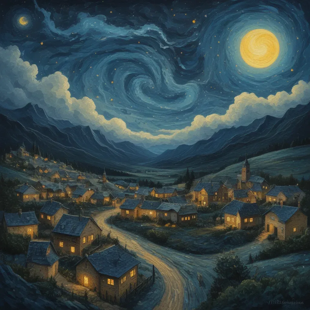 A quaint village with thatched roofs and stone walls bathed in the warm glow of lanterns and moonlight, creating a serene and inviting ambiance. The composition leads the eye through winding cobblestone streets, with dark, textured mountains and a starry sky in the background.