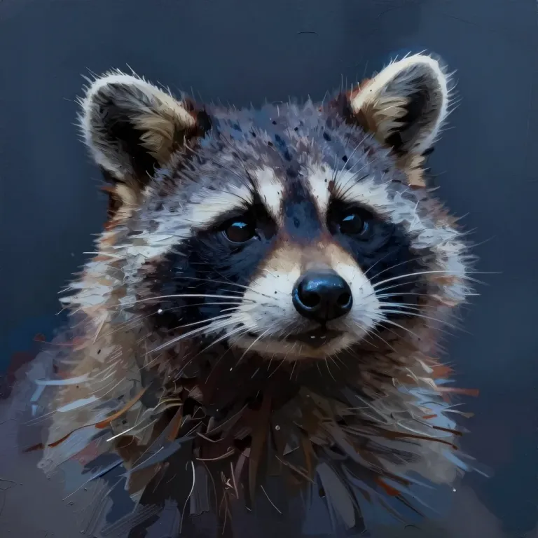 A close-up of a raccoon's face and upper body, its fur glistening with a glossy sheen, reflecting the soft, diffused light. The dark, blurred background enhances the raccoon's prominence, creating a striking contrast.