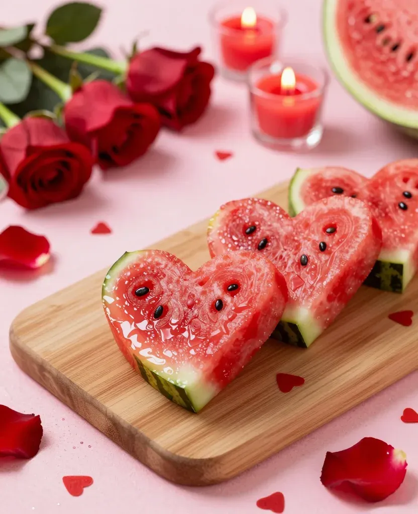 Glossy red watermelon slices cut into heart shapes are arranged on a rustic wooden cutting board, illuminated by warm ambient light that highlights the vibrant red flesh and rough texture of the wood. The shallow depth of field draws focus to the heart-shaped slices, while the soft pink background and scattered rose petals and candles create a romantic and elegant setting.