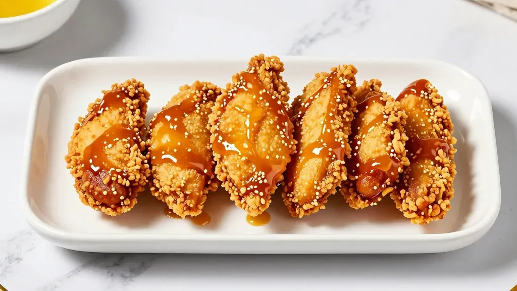 Five crispy chicken wings coated in a glossy amber glaze and sesame breading are arranged in a linear row on a white rectangular tray. Soft overhead lighting creates reflective highlights on the viscous glaze and emphasizes the granular texture, while a shallow depth of field focuses attention on the central wing against a clean, minimalist marble background.