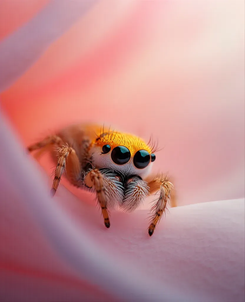 A close-up of a golden jumping spider with glossy black eyes, set against a soft, diffused light that highlights its fuzzy texture and pastel pink background. The shallow depth of field and blurred pink petals create a dreamy, foggy effect, making the spider the focal point of the image.