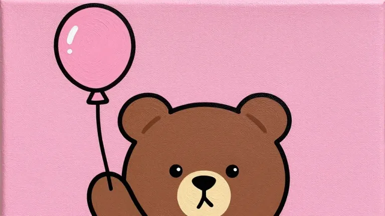 A soft, plush teddy bear holds a pink balloon against a solid pink background. The gentle lighting highlights the bear's form and creates a warm, inviting atmosphere.