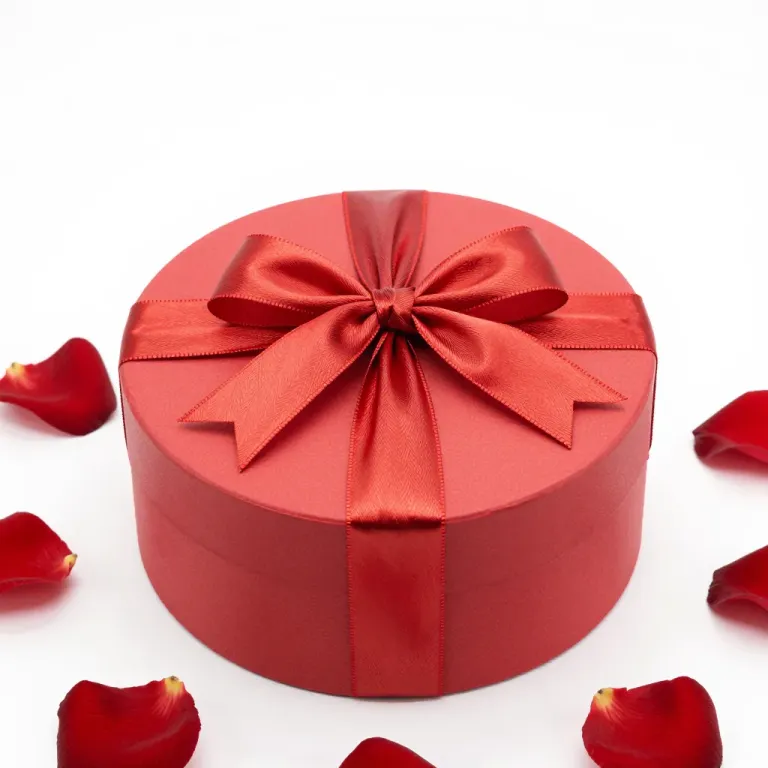 A glossy red heart-shaped gift box adorned with a smooth red ribbon bow, surrounded by delicate rose petals, set against a pure white background. The soft, diffused lighting highlights the reflective surfaces and creates a gentle glow, emphasizing the box as the focal point.