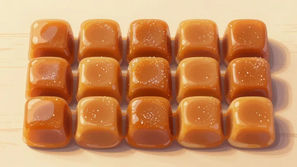 Golden caramel cubes arranged in a neat grid with coarse salt sprinkling, illuminated by soft, warm light from above, creating gentle shadows and a creamy background that provides contrast and depth.