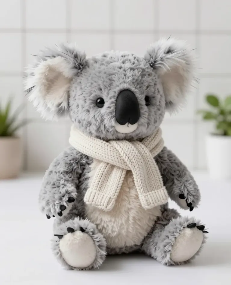 A soft, fluffy plush koala adorned with a cream-colored knitted scarf sits on a white tiled surface, with diffused lighting highlighting its texture and a blurred green plant in the background. The shallow depth of field draws attention to the plush subject, creating a clean and focused composition.